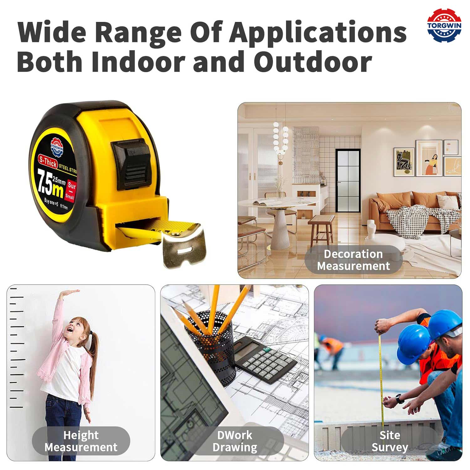 1। অ্যাপ্লিকেশনগুলির বিস্তৃত পরিসীমা - ইনডোর এবং আউটডোর:আমাদের টেপ পরিমাপ হ'ল একটি বহুমুখী সরঞ্জাম যা বিভিন্ন কাজের জন্য উপযুক্ত, সহ: